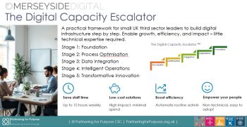 The Digital Capacity Escalator (part of the Merseyside Digital project) is a practical framework to help small organisations incrementally build digital infrastructure step by step across five stages Stage 1: Foundation Stage 2: Process Optimisation Stage 3: Data Integration Stage 4: Intelligent Operations Stage 5: Transformative Innovation It can enable…
